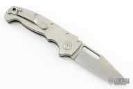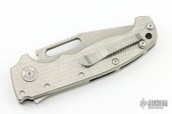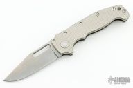 This AD20 by Demko Knives features a stonewashed blade with notched thumbrest and dual thumbstuds.   The handle has a textured titanium frame with a tip up stainless steel clip and "Shark" lock release on the spine. Comes with original box. Excellent condition.