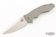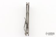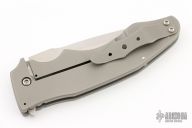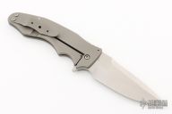 This Backlash by David Mosier features a satin finished blade with a notched thumbrest.  The handle features a bead blasted titanium frame with a matching tip up pocket clip.  Nice detent, lock up and blade seating.  There are a couple of light scratches on the blade otherwise the knife is in excellent condition.