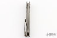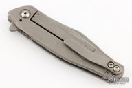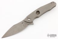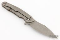This knife is a collaboration between Geoff Blauvelt of "Tuffknives" and Liong Mah. Features an acid tumbled spear point blade with flipper. The handle has a tumbled titanium frame with matching tip up clip and pivot collar. Nice detent, action, lockup and blade seating. Has a couple light scuffs, excellent condition.