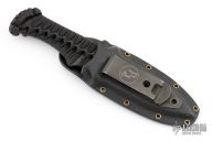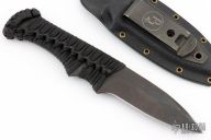 This Blood Shark by Tracker Dan features a spear point blade with sharpened top edge, .158" blade stock and 1" blade depth. The handle has a black cord wrap over black cord under wrap. Comes with a 3/4 kydex sheath and the knife will fit in either direction. Excellent condition.