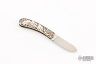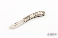 This knife by Jim Corrado was made as the 1994 AKCA Club Knife. It features a hand rub satin finished blade with nail nick. The handle has engraved silver covers, stainless steel spring, has half-stop. Excellent condition. #50 of 70