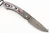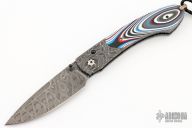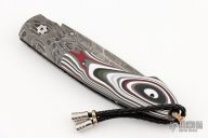 This B12 RAD by William Henry Fine Knives features a Mike Norris "Hornets Nest" Damascus blade, single thumbstud with black onyx inset. The handle has a Chad Nichols "X Out" Damascus frame with Fordite (AKA Motor City Agate) scales, sterling silver lanyard bail with black leather lanyard. Nice lockup and blade seating. Comes with original box, sheath and COA dated July 8, 2022. Excellent condition.