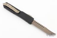 This Ultratech Hellhound by Microtech Knives features a bonzed apocalyptic finished blade with notched thumbrest and fullers, false top edge. The handle has a black aluminum frame with black G-10 top, with tip down bronzed stainless steel clip and hardware. Comes with Microtech box and papers. Excellent condition. Dated 04/2018.