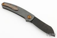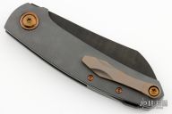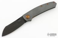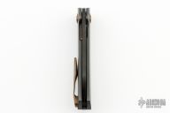This Haddock by Jens Anso features a DLC Damasteel blade with nail nick. The handle has a fine checker milled zirconium frame, anodized titanium tip up clip, zirconium backspacer with lanyard hole, anodized titanium hardware and pivot collars. Nice detent, lockup and blade seating. Rides on bronze washers. Comes with original box and COA dated April 2023. Excellent condition.