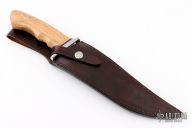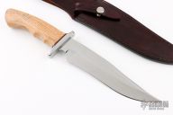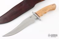 This knife by Benjahmin Knives features a mirror polished blade with false top edge, .162" blade stock and 1.694" blade depth, hidden tang construction. The handle has a stainless steel guard with a wood grip with micarta spacer. Comes with a black leather sheath. New from maker.