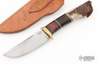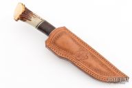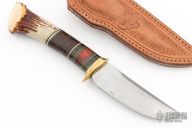 This knife by CJ Moll features a hand rub satin finished blade with false top edge, .251" blade stock and 1.216" blade depth, hidden tang construction. The handle has brass guard, crown stag butt and spacer pattern of black micarta/brass/black/white/wood/leather. Comes with a hand tooled brown leather sheath. Has some patina and a pitted spot on the blade, otherwise good condition.