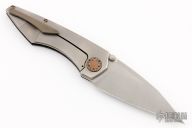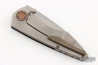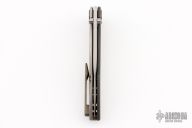 This Mini-Goblin features a bead blasted blade with dual thumb studs.  The handle has a carbon fiber and blasted titanium frame with an anodized titanium backspacer and tip up clip. Rides on bearings, nice detent, lockup and blade seating.  Includes the original box and papers.  New from maker!