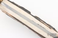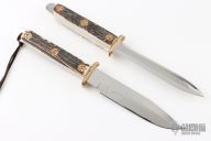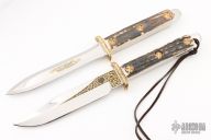 The M4 is one of EKs most popular models. This is a commemorative knife issued in 1991 celebrating John Ek's 50th anniversary of knifemaking. Blade is highly polished and features anniversary gold engraving. The guard is gold plated and engraved as are the 6 cross nut fasteners. Heavy stag handle scales. Comes with a glass top presentation box, Letter of Authenticity and commemorative patch. Excellent condition.