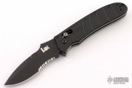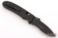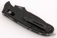 This 14905SBT HK Auto Axis was made for Heckler & Koch by Benchmade. It features a black coated drop point blade with swedge, partial serrations and notched thumb ramp. The handle has black G10 scales over steel liners and black polymer backspacer and barrel spacers. Sliding safety on spine. Tip up clip is reversible for right or left hand carry. Includes original box and papers. Excellent Condition.