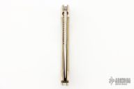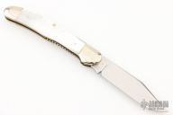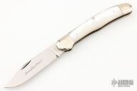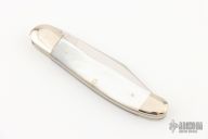 This knife by Queen Cutlery features a mirror polished blade with nail nick. The handle has nickel silver bolsters, front and rear, mother of pearl covers, brass liners and a fileworked stainless steel locking liner. The liner does not lock the knife open, it slips when you try to close it, otherwise excellent condition.