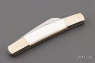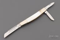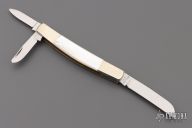 This slipjoint by Parker Custom Series has mirror polished blades with nail nicks. Nickel silver bolsters, mother of pearl covers, brass liners, stainless steel springs. Has a couple light scratches, otherwise excellent condition.