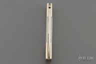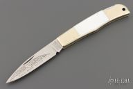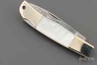This lockback by Parker has a satin finished blade with nail nick. Nickel silver bolsters, mother of pearl covers, nickel silver liners, stainless steel spring. Has a couple light scratches, otherwise excellent condition.