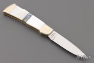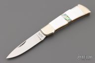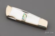 This lockback by Taylor Cutlery has a mirror finished blade with nail nick. Nickel silver bolsters, mother of pearl and abalone covers, brass liners, stainless steel spring. Has a couple light scratches, otherwise excellent condition.