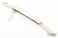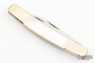This slipjoint by Parker Custom Series has mirror polished blades with nail nicks. Nickel silver bolsters, mother of pearl covers, brass liners, stainless steel springs. Has a couple light scratches, otherwise excellent condition.