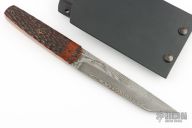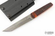 This Aikuchi by Bud Nealy features a Meier Steel Damascus tanto style blade with .104" blade stock and 1.003" blade depth, full tang construction. The handle has jigged bone scales. Includes MCS Sheath system with jacket pocket flap. Excellent Condition.