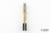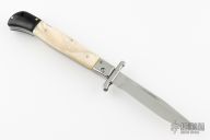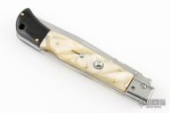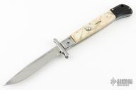 This Swing Guard Lockback Auto by AKC Italy has a polished stainless steel blade with fullers. The handle has pearlex scales with stainless steel bolsters, stainless steel liners, and stainless steel back spacer and lock, black wood rear bolsters.  This knife has been professionally tuned and polished by Greg's Effects.  Includes a leather sheath.  Excellent Condition.