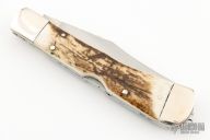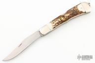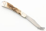 This Trapper by Case Knives has been converted to a dual action automatic. It features a hand rub satin finished clip point blade with swedge and nail nick. The handle is comprised of nickel silver double bolsters and stag scales with .32 push button over brass liners and a fileworked stainless steel lockbar. Has some light scratches, otherwise excellent condition.