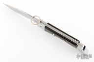 This knife by A.G.A Campolin is a large push button automatic with sliding safety. Has a clip point blade with a polished stonewash finish. The handle has stainless steel bolsters, buffalo horn scales, stainless steel liners and backspacer. Ring Pull unlocking mechanism. Dated 2009. Has a few light  scratches otherwise excellent condition.