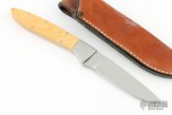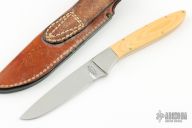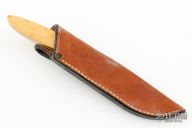 This bird and trout by Ray Warren features a mirror polished blade with .104" blade stock and .739" blade depth, full tapered tang construction. The handle has dovetailed stainless steel bolsters, Westinghouse paper micarta scales. Comes with a brown leather sheath. Excellent condition.