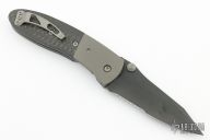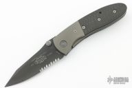 This Lightfoot LCC D/A side opener by Microtech has a black partially serrated blade, bead blasted titanium bolsters, and carbon fiber scales. Stainless steel clip and liners. Dated 12/2000 and #3216. Comes with original box, papers, and nylon sheath. Excellent condition.