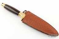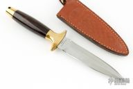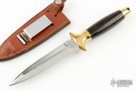 This 712 Dagger by Jaws features a mirror finished double edged blade with fullers, .186" blade stock and .961" blade depth, hidden tang construction. The handle has a brass guard and butt with wood grip. Comes with a leather sheath. Excellent condition.