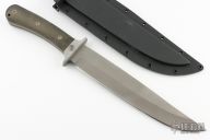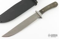 This Bison by Entrek Knives features a bead blasted blade with .256" blade stock and 1.530" blade depth, full tang construction. The handle is comprised of a bead blasted aluminum guard and black canvas micarta scales. Lanyard tube in pommel. Includes kydex sheath with belt loop. Has some scuffs and scratches, otherwise good condition.