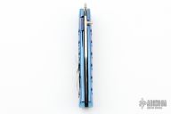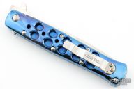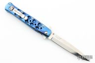 This Ti-Lite by Cold Steel features a mirror finished blade with false top edge and single thumbstud. Anodized titanium handle with anodized titanium liner  and a tip up stainless steel clip. Has a couple light scratches, excellent condition. Comes with a zippered case.