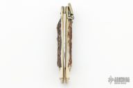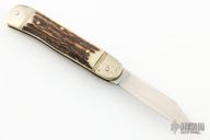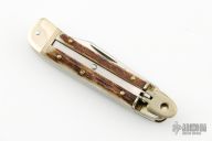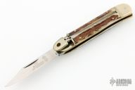 This leverlock auto by Hubertus features a mirror polished blade, nickel silver double bolsters, stag scales, nickel silver liners and brass pins. Opens with a nice snap. Very fast opening. Has some very light scuffs, scratches, and patina. Great condition otherwise.