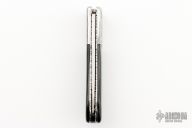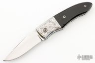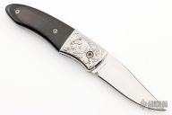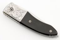 This Scale Release Auto by Wayne Whittaker features a mirror polish drop point blade. The handle has engraved stainless bolsters, buffalo horn scales, fileworked titanium liners and a fileworked blued stainless steel backspacer. Nice action, lockup and blade seating. Has a couple light scuffs, excellent condition otherwise.