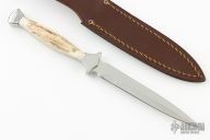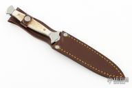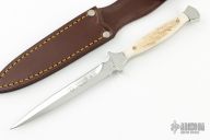 This dagger features a mirror polished blade with full tang construction.  .094" Blade Stock.  .6" Blade Depth.  The handle features stainless bolsters, front and rear, with brass pinned bone scales. Comes with a leather sheath. Has a few light scuffs and scratches, otherwise Excellent Condition.