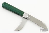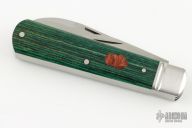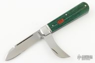 This Forager Jack by David Kramp features hand rub satin finished blades with nicks. The handle has fluted stainless steel bolsters, vintage Westinghouse wood phenolic covers with an Amboyna Burl acorn escutcheon, stainless steel pins, liners and springs. Has half-stops, flush in all positions. Comes with original box and COA dated June 21, 2023. New from maker at the 2023 Blade Show West.