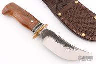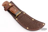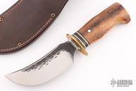 This Skinner by James Behring features a satin finished and hammer marked blade with false top edge, .253" blade stock and 1.658" blade depth, hidden tang construction. The handle has a brass guard, fossil oosic bone grip with black/white/brass spacers. Includes a hand tooled brown leather sheath. Has a crack in the handle through the pin, otherwise excellent condition.