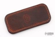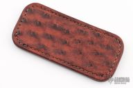 This leather slip sheath by Robertson Leather Works features Ostrich Skin. It is 3.75" long by 1.75" wide. New from maker at the 2023 Blade Show West.