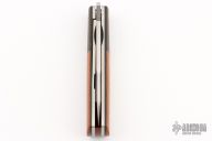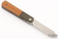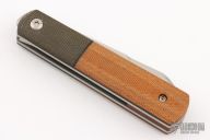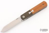 This Barlow Front Flipper Linerlock by Enrique Pena features a hand rub satin finished blade with front flipper and notched thumbrest. The handle has micarta scales with a stainless steel escutcheon, black liners, titanium frame and micarta backspacer. Comes with zippered case. New from maker at the 2023 Blade Show West.