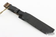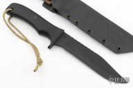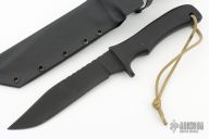 This knife by Greg Covington is a replica of a MadDog SEAL ATAK. It features a hand forged black blade with false top edge and fileworked spine, .254" blade stock and 1.380" blade depth, hidden tang construction. The handle has a black G-10 guard and grip with a lanyard hole at the butt. Comes with a kydex sheath. Has some light scuffs, otherwise excellent condition. One off