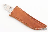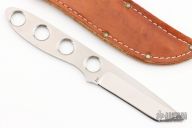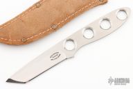 This Tanto by Kurt Meerdink features a satin finished drop point blade with 0.151" blade stock and 0.879" blade depth. The handle is comprised of skeletonized integral construction. Scuffs on handle and blade but overall good condition. Stamped 244 on "B" side ricasso. Comes with a brown leather sheath.