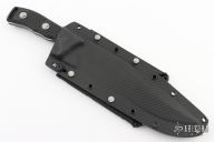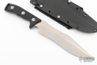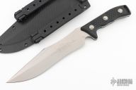 This Arbiter by Microtech features a stonewashed recurve blade with a notched thumbrest and sharpened top edge. The handle has black G-10 scales with blasted hardware. .209" blade thickness and 1.876" blade depth, full tang construction. Butt has a lanyard hole. Comes with kydex sheath with molle locks. Comes with original box and papers. Serial number 2786 and dated 05/20221. Excellent condition.