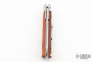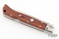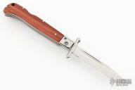 This Swing Guard Lockback Auto by AKC Italy has a polished stainless steel spear point blade with false top edge. The handle has wood scales with stainless steel bolsters, liners, and stainless steel back spacer and lock.  This knife has been professionally tuned and polished by Greg's Effects.  Includes a sheath.  Excellent Condition.