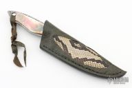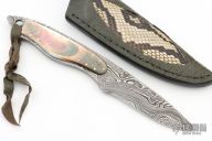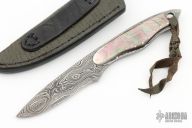 This Hunter by Thomas Haslinger features a Random Pattern Damascus blade (15N20 and 1084), .128" blade stock and .933" blade depth, full tang construction. The handle has black lip pearl scales with 14k gold pins, lanyard hole at the butt. Comes with a brown leather sheath with snakeskin inlay. Excellent condition.