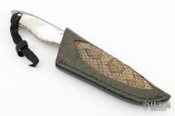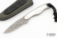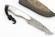 This Hunter by Thomas Haslinger features a Random Pattern Damascus blade with notched thumbrest, (15N20 and 1084), .133" blade stock and .925" blade depth, full tang construction. The handle has mother of pearl scales with 14k gold pins, lanyard hole at the butt. Comes with a brown leather sheath with snakeskin inlay. Excellent condition.