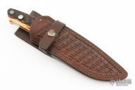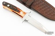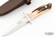 This Mini Wilderness by Gary Martindale features mirror polished blade with about 1/3 of the top edge sharpened, .180" blade stock and .877" blade depth, full tapered tang construction. The handle has a mirror polished stainless steel guard, stag scales with red liners and a stainless steel pins and lanyard hole. Includes a leather sheath with belt loop. Excellent condition.