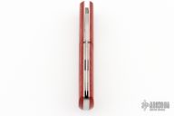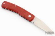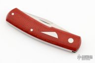 This Harper slipjoint by Nick Timpson of Birdvis Knives features a satin finished blade with nail nick. The handle has red canvas micarta covers, red G-10 liners, stainless steel escutcheon, stainless steel liners with jeweled interiors and stainless steel spring. Has half-stop, flush in all positions. Comes with original box, leather sheath and COA dated 11/2021. Excellent condition.