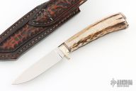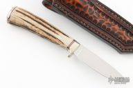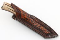 This hunter by Bob Schultz features a mirror finished drop point blade, .112" blade stock and .748" blade depth, hidden tang construction. The handle has nickel silver guard and butt with a stag grip, red and nickel silver spacers. Comes with a hand tooled brown leather sheath. Excellent condition.