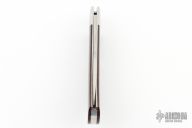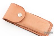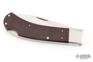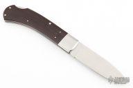 This lockback by Terry Barrett features a mirror polished blade with nail nick. The handle has stainless steel bolsters and liners, black linen micarta scales, stainless steel backspacer. Comes with a brown leather sheath and a zippered case. Has a few light scratches, otherwise excellent condition.