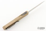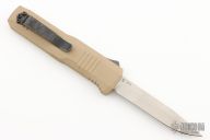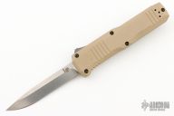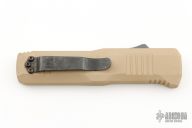 This is a 14808BK Turmoil double action OTF auto with a stonewashed clip point blade by Heckler & Koch. Tan aluminum frame with tip down black stainless clip, left or right reversible. Includes original packaging and paperwork. Excellent condtion.