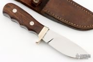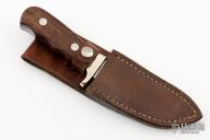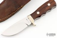 This skinner by Scott Morton features a mirror polished blade with notched thumbrest, .186" blade stock and 1.195" blade depth, full tapered tang construction. The handle has a nickel silver guard and walnut scales with black liners. Comes with a brown leather sheath. Has a little patina on the guard, otherwise excellent condition.