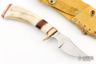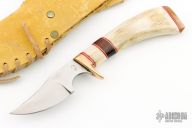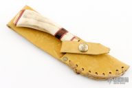 This knife features a satin finished blade with false top edge, .158" blade stock and 1.005" blade depth, hidden tang construction. The handle has a brass guard and butt with stag grip and red/white/wood spacers. Comes with a brown leather sheath. Excellent condition.