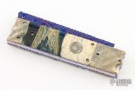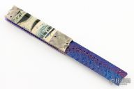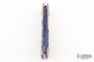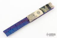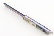 This Custom Box Razor side-opening automatic by Rainy Vallotton features a hot blued Chad Nichols "Boomerang" Damascus blade with fileworked spine. The handle has "Raindrop" mokume bolsters, blue stabilized bone scales with blue liners, "Raindrop" Mokume push button, fileworked stainless steel backspacer, fileworked and anodized titanium liners. Strong and fast leaf spring action. Nice function. Solid lockup and nice blade seating. Beautiful materials. New from maker. Comes with original box and COA.
