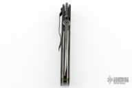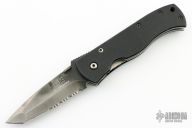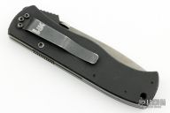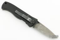 The 970SBK is the Benchmade version of the Emerson CQC7 folder. It has a black chisel ground partially serrated blade with notched thumbrest and a thumbdisc. The handle has black G-10 scales, titanium liners, black backspacer, lanyard hole, tip down black stainless clip. Has scuffs and scratches, has been resharpened, good user condition.