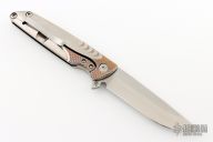 This Typhoon Framelock Flipper from Sharp By Design has a hand rub satin finished blade with notched thumb rest and flipper. Handle is anodized and milled 6AL-4V titanium, stainless steel tip up clip, stainless steel lock bar insert, and milled titanium backspacer. Flips wonderfully. Excellent lockup and detent, with dead center blade seating. Beautiful piece. Comes with original box. Excellent condition. From the first run.